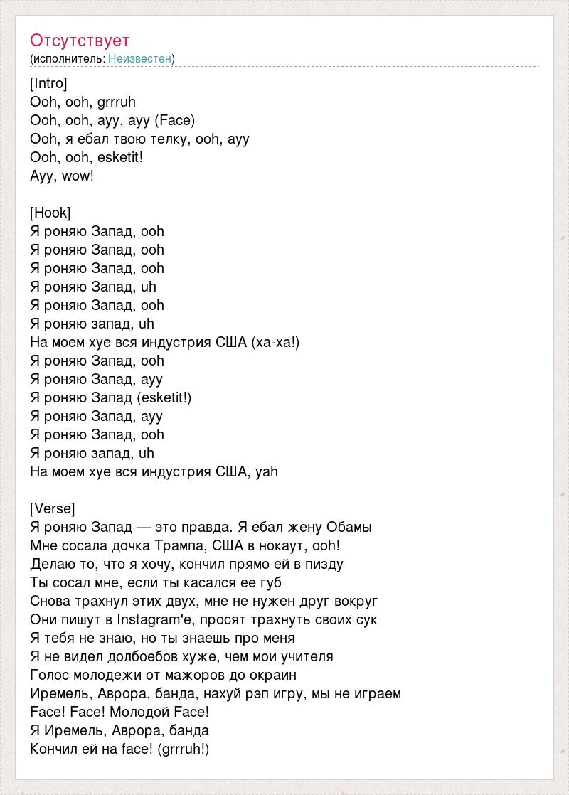 [Intro] Ooh, ooh, grrruh Ooh, ooh, ayy, ayy (Face) Ooh, я ебал твою телку, ooh, ayy Ooh, ooh, esketit! Ayy, wow! [Hook] Я роняю Запад, ooh Я роняю Запад, ooh Я роняю Запад, ooh Я роняю Запад, uh Я роняю Запад, ooh Я роняю запад, uh На моем хуе вся индустрия США (ха-ха!) Я роняю Запад, ooh Я роняю Запад, ayy Я роняю Запад (esketit!) Я роняю Запад, ayy Я роняю Запад, ooh Я роняю запад, uh На моем хуе вся индустрия США, yah [Verse] Я роняю Запад — это правда. Я ебал жену Обамы Мне сосала дочка Трампа, США в нокаут, ooh! Делаю то, что я хочу, кончил прямо ей в пизду Ты сосал мне, если ты касался ее губ Снова трахнул этих двух, мне не нужен друг вокруг Они пишут в Instagram'е, просят трахнуть своих сук Я тебя не знаю, но ты знаешь про меня Я не видел долбоебов хуже, чем мои учителя Голос молодежи от мажоров до окраин Иремель, Аврора, банда, нахуй рэп игру, мы не играем Face! Face! Молодой Face! Я Иремель, Аврора, банда Кончил ей на face! (grrruh!)