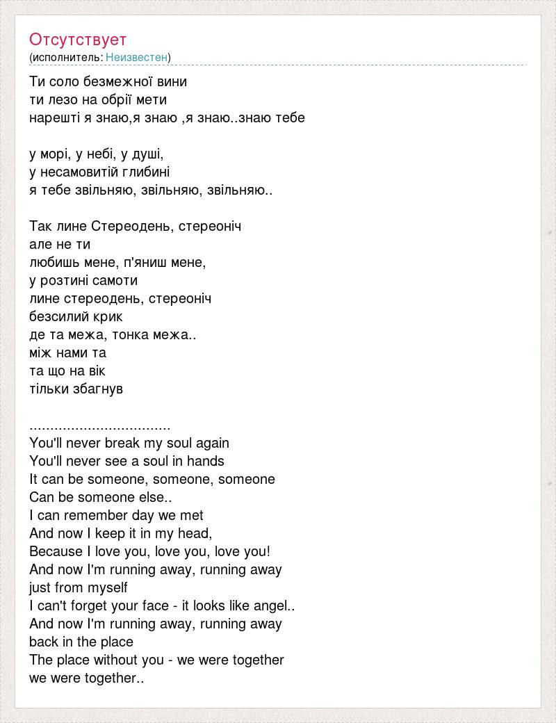 Ти соло безмежної вини ти лезо на обрії мети нарешті я знаю,я знаю ,я знаю..знаю тебе у морі, у небі, у душі, у несамовитій глибині я тебе звільняю, звільняю, звільняю.. Так лине Стереодень, стереоніч але не ти любишь мене, п'яниш мене, у розтині самоти лине стереодень, стереоніч безсилий крик де та межа, тонка межа.. між нами та та що на вік тільки збагнув .................................. You'll never break my soul again You'll never see a soul in hands It can be someone, someone, someone Can be someone else.. I can remember day we met And now I keep it in my head, Because I love you, love you, love you! And now I'm running away, running away just from myself I can't forget your face - it looks like angel.. And now I'm running away, running away back in the place The place without you - we were together we were together..