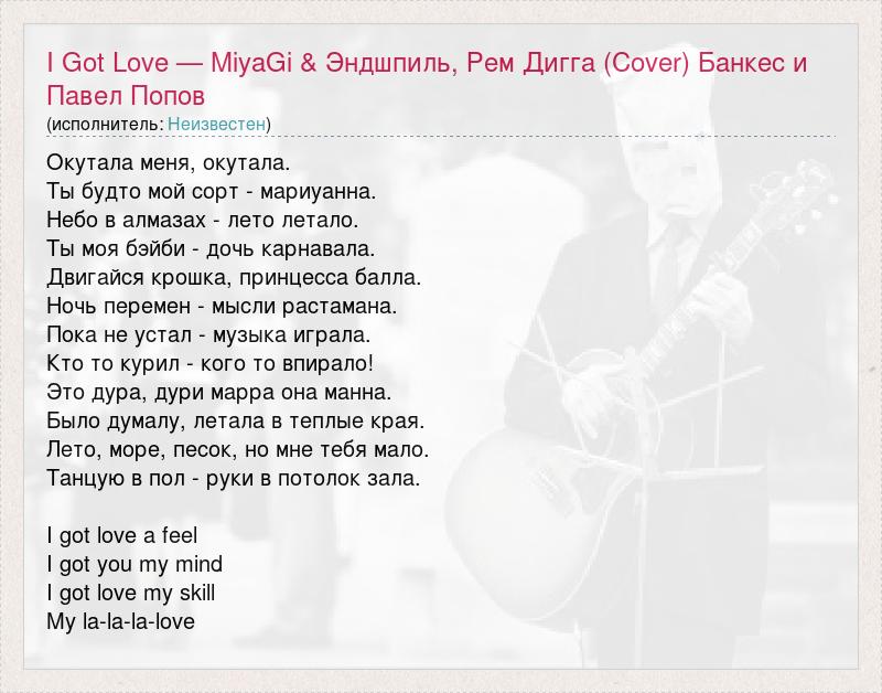 Окутала меня, окутала. Ты будто мой сорт - мариуанна. Небо в алмазах - лето летало. Ты моя бэйби - дочь карнавала. Двигайся крошка, принцесса балла. Ночь перемен - мысли растамана. Пока не устал - музыка играла. Кто то курил - кого то впирало! Это дура, дури марра она манна. Было думалу, летала в теплые края. Лето, море, песок, но мне тебя мало. Танцую в пол - руки в потолок зала. I got love a feel I got you my mind I got love my skill My la-la-la-love