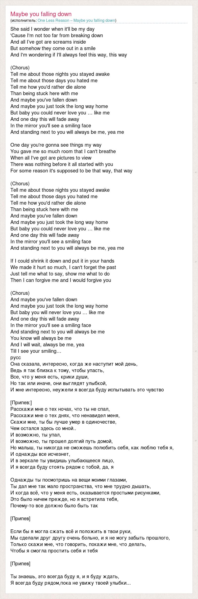 She said I wonder when it'll be my day 'Cause I'm not too far from breaking down And all I’ve got are screams inside But somehow they come out in a smile And I'm wondering if I'll always feel this way, this way (Chorus) Tell me about those nights you stayed awake Tell me about those days you hated me Tell me how you'd rather die alone Than being stuck here with me And maybe you've fallen down And maybe you just took the long way home But baby you could never love you … like me And one day this will fade away In the mirror you'll see a smiling face And standing next to you will always be me, yea me One day you're gonna see things my way You gave me so much room that I can't breathe When all I've got are pictures to view There was nothing before it all started with you For some reason it's supposed to be that way, that way (Chorus) Tell me about those nights you stayed awake Tell me about those days you hated me Tell me how you'd rather die alone Than being stuck here with me And maybe you've fallen down And maybe you just took the long way home But baby you could never love you … like me And one day this will fade away In the mirror you'll see a smiling face And standing next to you will always be me, yea me If I could shrink it down and put it in your hands We made it hurt so much, I can't forget the past Just tell me what to say, show me what to do Then I can forgive me and I would forgive you (Chorus) And maybe you've fallen down And maybe you just took the long way home But baby you will never love you … like me And one day this will fade away In the mirror you'll see a smiling face And standing next to you will always be me You know will always be me And I will wait, always be me, yea Till I see your smiling… русс Она сказала, интересно, когда же наступит мой день, Ведь я так близка к тому, чтобы упасть, Все, что у меня есть, крики души, Но так или иначе, они выглядят улыбкой, И мне интересно, неужели я всегда буду испытывать это чувство [Припев:] Расскажи мне о тех ночах, что ты не спал, Расскажи мне о тех днях, что ненавидел меня, Скажи мне, ты бы лучше умер в одиночестве, Чем остался здесь со мной.. И возможно, ты упал, И возможно, ты прошел долгий путь домой, Но малыш, ты никогда не сможешь полюбить себя, как люблю тебя я, И однажды все исчезнет, И в зеркале ты увидишь улыбающееся лицо, И я всегда буду стоять рядом с тобой, да, я Однажды ты посмотришь на вещи моими глазами, Ты дал мне так мало пространства, что мне трудно дышать, И когда всё, что у меня есть, оказывается простыми рисунками, Это было ничем прежде, но я встретила тебя, Почему-то все должно было быть так [Припев] Если бы я могла сжать всё и положить в твои руки, Мы сделали друг другу очень больно, и я не могу забыть прошлого, Только скажи мне, что говорить, покажи мне, что делать, Чтобы я смогла простить себя и тебя [Припев] Ты знаешь, это всегда буду я, и я буду ждать, Я всегда буду рядом,пока не увижу твоей улыбки...