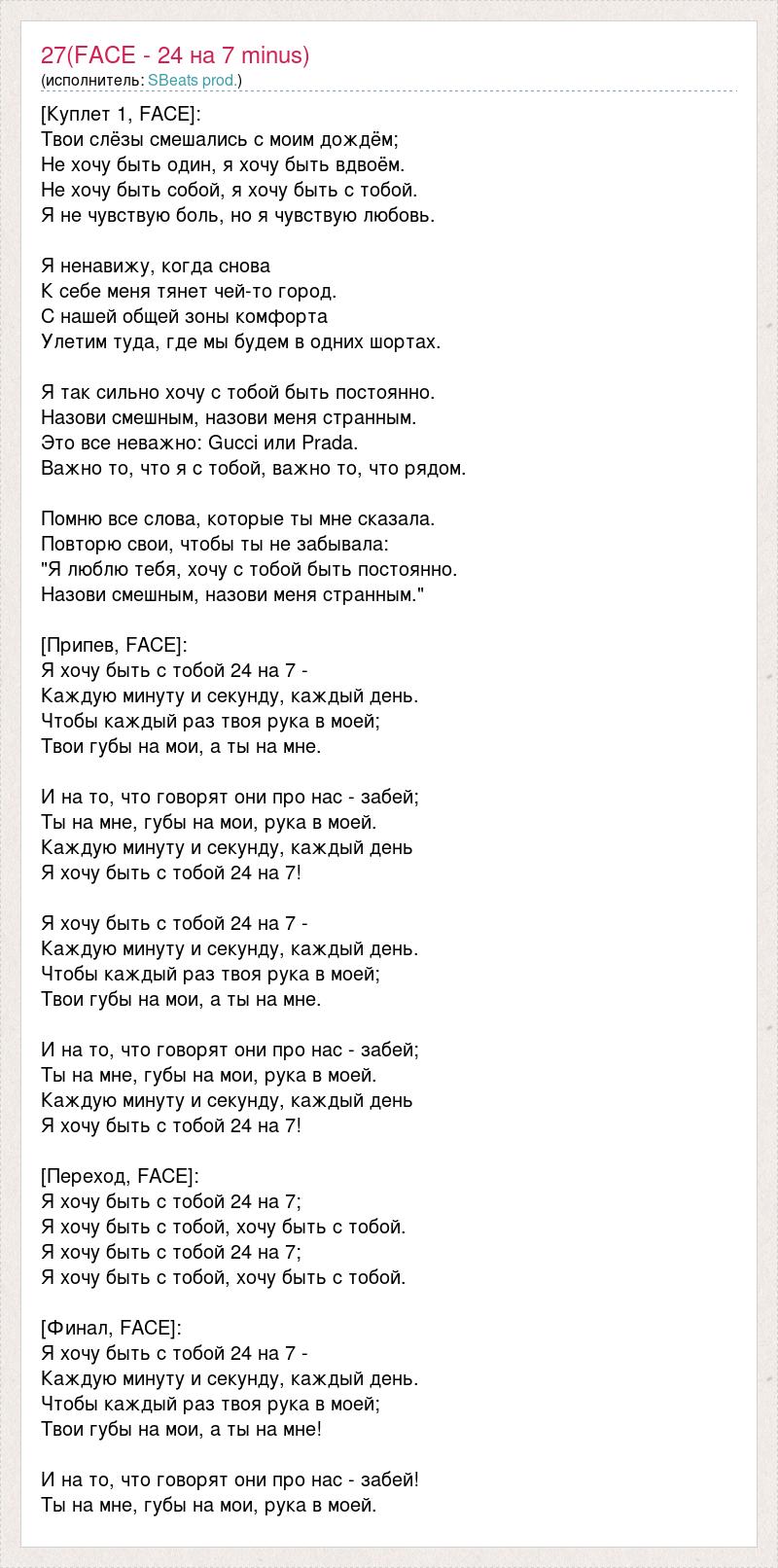 [Куплет 1, FACE]: Твои слёзы смешались с моим дождём; Не хочу быть один, я хочу быть вдвоём. Не хочу быть собой, я хочу быть с тобой. Я не чувствую боль, но я чувствую любовь. Я ненавижу, когда снова К себе меня тянет чей-то город. С нашей общей зоны комфорта Улетим туда, где мы будем в одних шортах. Я так сильно хочу с тобой быть постоянно. Назови смешным, назови меня странным. Это все неважно: Gucci или Prada. Важно то, что я с тобой, важно то, что рядом. Помню все слова, которые ты мне сказала. Повторю свои, чтобы ты не забывала: "Я люблю тебя, хочу с тобой быть постоянно. Назови смешным, назови меня странным." [Припев, FACE]: Я хочу быть с тобой 24 на 7 - Каждую минуту и секунду, каждый день. Чтобы каждый раз твоя рука в моей; Твои губы на мои, а ты на мне. И на то, что говорят они про нас - забей; Ты на мне, губы на мои, рука в моей. Каждую минуту и секунду, каждый день Я хочу быть с тобой 24 на 7! Я хочу быть с тобой 24 на 7 - Каждую минуту и секунду, каждый день. Чтобы каждый раз твоя рука в моей; Твои губы на мои, а ты на мне. И на то, что говорят они про нас - забей; Ты на мне, губы на мои, рука в моей. Каждую минуту и секунду, каждый день Я хочу быть с тобой 24 на 7! [Переход, FACE]: Я хочу быть с тобой 24 на 7; Я хочу быть с тобой, хочу быть с тобой. Я хочу быть с тобой 24 на 7; Я хочу быть с тобой, хочу быть с тобой. [Финал, FACE]: Я хочу быть с тобой 24 на 7 - Каждую минуту и секунду, каждый день. Чтобы каждый раз твоя рука в моей; Твои губы на мои, а ты на мне! И на то, что говорят они про нас - забей! Ты на мне, губы на мои, рука в моей.