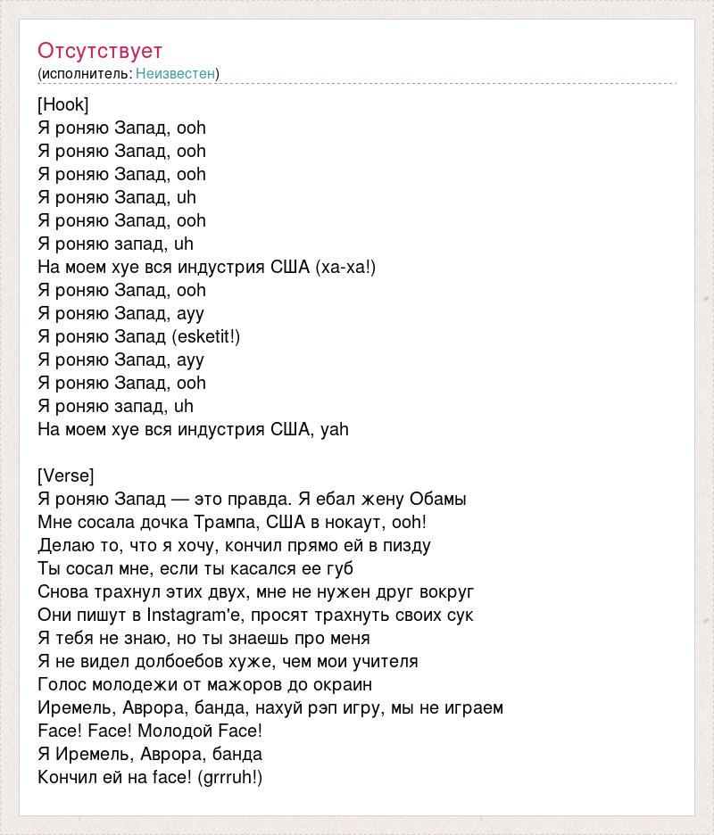 [Hook] Я роняю Запад, ooh Я роняю Запад, ooh Я роняю Запад, ooh Я роняю Запад, uh Я роняю Запад, ooh Я роняю запад, uh На моем хуе вся индустрия США (ха-ха!) Я роняю Запад, ooh Я роняю Запад, ayy Я роняю Запад (esketit!) Я роняю Запад, ayy Я роняю Запад, ooh Я роняю запад, uh На моем хуе вся индустрия США, yah [Verse] Я роняю Запад — это правда. Я ебал жену Обамы Мне сосала дочка Трампа, США в нокаут, ooh! Делаю то, что я хочу, кончил прямо ей в пизду Ты сосал мне, если ты касался ее губ Снова трахнул этих двух, мне не нужен друг вокруг Они пишут в Instagram'е, просят трахнуть своих сук Я тебя не знаю, но ты знаешь про меня Я не видел долбоебов хуже, чем мои учителя Голос молодежи от мажоров до окраин Иремель, Аврора, банда, нахуй рэп игру, мы не играем Face! Face! Молодой Face! Я Иремель, Аврора, банда Кончил ей на face! (grrruh!)