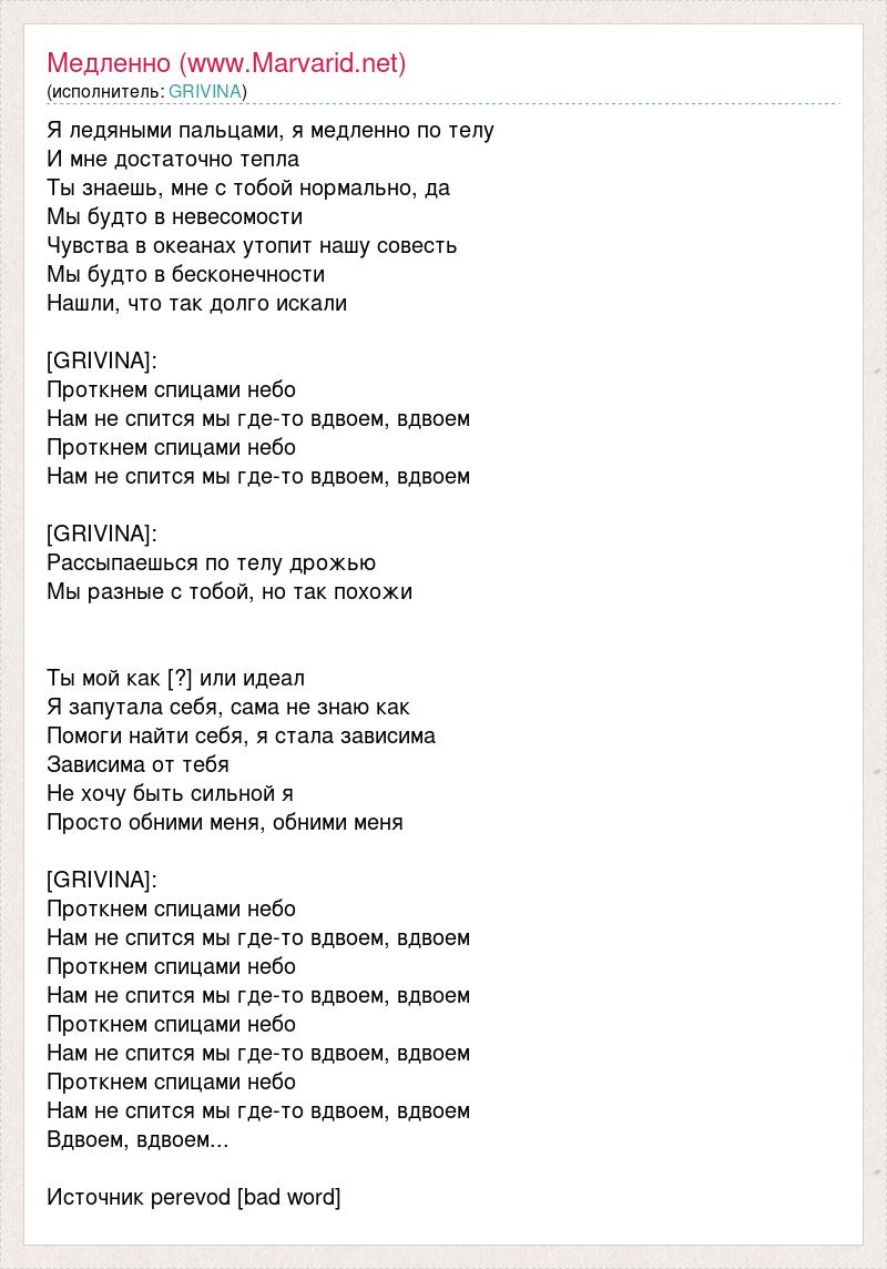 Я ледяными пальцами, я медленно по телу И мне достаточно тепла Ты знаешь, мне с тобой нормально, да Мы будто в невесомости Чувства в океанах утопит нашу совесть Мы будто в бесконечности Нашли, что так долго искали [GRIVINA]: Проткнем спицами небо Нам не спится мы где-то вдвоем, вдвоем Проткнем спицами небо Нам не спится мы где-то вдвоем, вдвоем [GRIVINA]: Рассыпаешься по телу дрожью Мы разные с тобой, но так похожи Ты мой как [?] или идеал Я запутала себя, сама не знаю как Помоги найти себя, я стала зависима Зависима от тебя Не хочу быть сильной я Просто обними меня, обними меня [GRIVINA]: Проткнем спицами небо Нам не спится мы где-то вдвоем, вдвоем Проткнем спицами небо Нам не спится мы где-то вдвоем, вдвоем Проткнем спицами небо Нам не спится мы где-то вдвоем, вдвоем Проткнем спицами небо Нам не спится мы где-то вдвоем, вдвоем Вдвоем, вдвоем... Источник perevod [bad word]