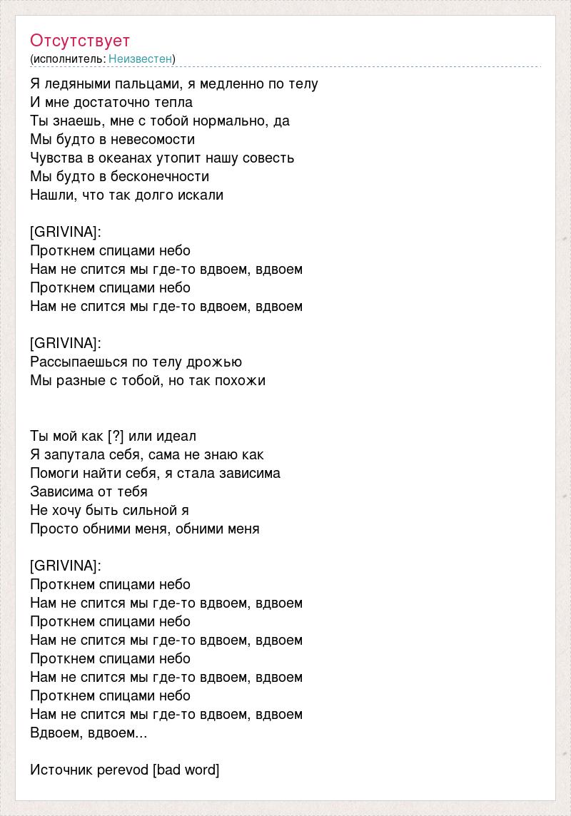 Я ледяными пальцами, я медленно по телу И мне достаточно тепла Ты знаешь, мне с тобой нормально, да Мы будто в невесомости Чувства в океанах утопит нашу совесть Мы будто в бесконечности Нашли, что так долго искали [GRIVINA]: Проткнем спицами небо Нам не спится мы где-то вдвоем, вдвоем Проткнем спицами небо Нам не спится мы где-то вдвоем, вдвоем [GRIVINA]: Рассыпаешься по телу дрожью Мы разные с тобой, но так похожи Ты мой как [?] или идеал Я запутала себя, сама не знаю как Помоги найти себя, я стала зависима Зависима от тебя Не хочу быть сильной я Просто обними меня, обними меня [GRIVINA]: Проткнем спицами небо Нам не спится мы где-то вдвоем, вдвоем Проткнем спицами небо Нам не спится мы где-то вдвоем, вдвоем Проткнем спицами небо Нам не спится мы где-то вдвоем, вдвоем Проткнем спицами небо Нам не спится мы где-то вдвоем, вдвоем Вдвоем, вдвоем... Источник perevod [bad word]