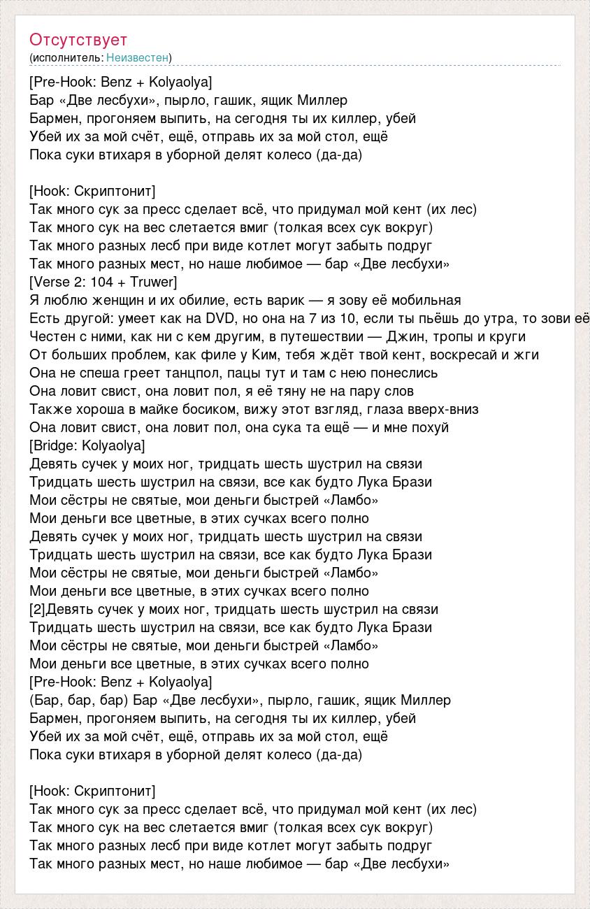 [Pre-Hook: Benz + Kolyaolya] Бар «Две лесбухи», пырло, гашик, ящик Миллер Бармен, прогоняем выпить, на сегодня ты их киллер, убей Убей их за мой счёт, ещё, отправь их за мой стол, ещё Пока суки втихаря в уборной делят колесо (да-да) [Hook: Скриптонит] Так много сук за пресс сделает всё, что придумал мой кент (их лес) Так много сук на вес слетается вмиг (толкая всех сук вокруг) Так много разных лесб при виде котлет могут забыть подруг Так много разных мест, но наше любимое — бар «Две лесбухи» [Verse 2: 104 + Truwer] Я люблю женщин и их обилие, есть варик — я зову её мобильная Есть другой: умеет как на DVD, но она на 7 из 10, если ты пьёшь до утра, то зови её Честен с ними, как ни с кем другим, в путешествии — Джин, тропы и круги От больших проблем, как филе у Ким, тебя ждёт твой кент, воскресай и жги Она не спеша греет танцпол, пацы тут и там с нею понеслись Она ловит свист, она ловит пол, я её тяну не на пару слов Также хороша в майке босиком, вижу этот взгляд, глаза вверх-вниз Она ловит свист, она ловит пол, она сука та ещё — и мне похуй [Bridge: Kolyaolya] Девять сучек у моих ног, тридцать шесть шустрил на связи Тридцать шесть шустрил на связи, все как будто Лука Брази Мои сёстры не святые, мои деньги быстрей «Ламбо» Мои деньги все цветные, в этих сучках всего полно Девять сучек у моих ног, тридцать шесть шустрил на связи Тридцать шесть шустрил на связи, все как будто Лука Брази Мои сёстры не святые, мои деньги быстрей «Ламбо» Мои деньги все цветные, в этих сучках всего полно [2]Девять сучек у моих ног, тридцать шесть шустрил на связи Тридцать шесть шустрил на связи, все как будто Лука Брази Мои сёстры не святые, мои деньги быстрей «Ламбо» Мои деньги все цветные, в этих сучках всего полно [Pre-Hook: Benz + Kolyaolya] (Бар, бар, бар) Бар «Две лесбухи», пырло, гашик, ящик Миллер Бармен, прогоняем выпить, на сегодня ты их киллер, убей Убей их за мой счёт, ещё, отправь их за мой стол, ещё Пока суки втихаря в уборной делят колесо (да-да) [Hook: Скриптонит] Так много сук за пресс сделает всё, что придумал мой кент (их лес) Так много сук на вес слетается вмиг (толкая всех сук вокруг) Так много разных лесб при виде котлет могут забыть подруг Так много разных мест, но наше любимое — бар «Две лесбухи»