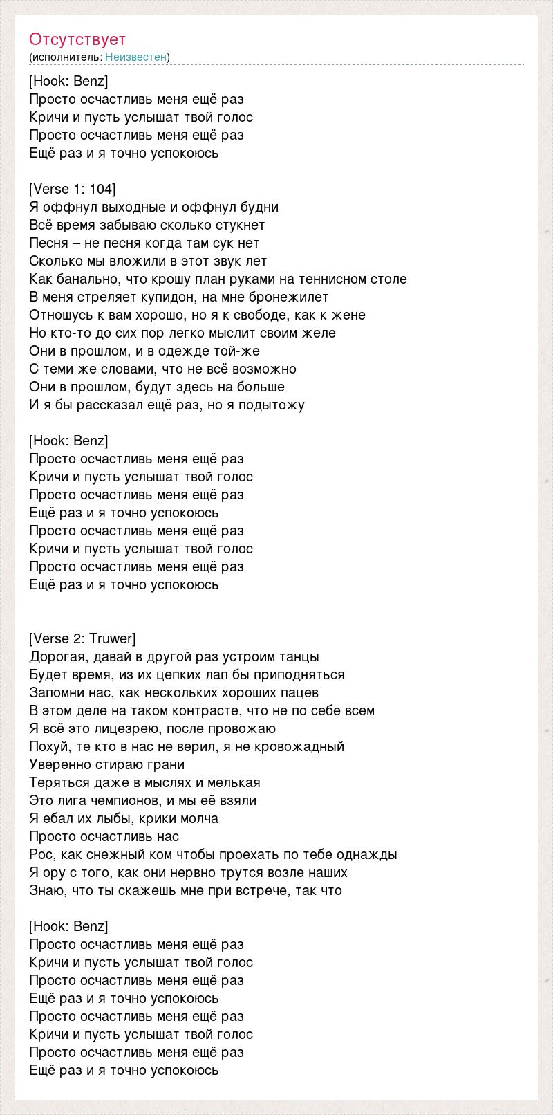 [Hook: Benz] Просто осчастливь меня ещё раз Кричи и пусть услышат твой голос Просто осчастливь меня ещё раз Ещё раз и я точно успокоюсь [Verse 1: 104] Я оффнул выходные и оффнул будни Всё время забываю сколько стукнет Песня – не песня когда там сук нет Сколько мы вложили в этот звук лет Как банально, что крошу план руками на теннисном столе В меня стреляет купидон, на мне бронежилет Отношусь к вам хорошо, но я к свободе, как к жене Но кто-то до сих пор легко мыслит своим желе Они в прошлом, и в одежде той-же С теми же словами, что не всё возможно Они в прошлом, будут здесь на больше И я бы рассказал ещё раз, но я подытожу [Hook: Benz] Просто осчастливь меня ещё раз Кричи и пусть услышат твой голос Просто осчастливь меня ещё раз Ещё раз и я точно успокоюсь Просто осчастливь меня ещё раз Кричи и пусть услышат твой голос Просто осчастливь меня ещё раз Ещё раз и я точно успокоюсь [Verse 2: Truwer] Дорогая, давай в другой раз устроим танцы Будет время, из их цепких лап бы приподняться Запомни нас, как нескольких хороших пацев В этом деле на таком контрасте, что не по себе всем Я всё это лицезрею, после провожаю Похуй, те кто в нас не верил, я не кровожадный Уверенно стираю грани Теряться даже в мыслях и мелькая Это лига чемпионов, и мы её взяли Я ебал их лыбы, крики молча Просто осчастливь нас Рос, как снежный ком чтобы проехать по тебе однажды Я ору с того, как они нервно трутся возле наших Знаю, что ты скажешь мне при встрече, так что [Hook: Benz] Просто осчастливь меня ещё раз Кричи и пусть услышат твой голос Просто осчастливь меня ещё раз Ещё раз и я точно успокоюсь Просто осчастливь меня ещё раз Кричи и пусть услышат твой голос Просто осчастливь меня ещё раз Ещё раз и я точно успокоюсь